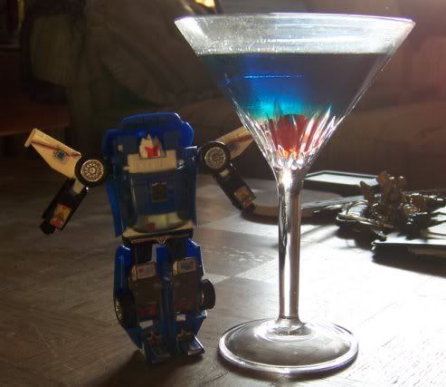 Now we come to ROTF, where Tracks is painted silver and called Sideswipe. I have no idea why as he acts like Tracks, he has the same alt mode as Tracks, and he is not much like Sideswipe. He’s Tracks in my book. And for the record, he didn’t get near enough screen time. Since he’s a little more slick and high society than his G1 counterpart I figure I’d give him a drink of a similar fashion. Looking for name suggestions for this one, current one is just a place holder really.